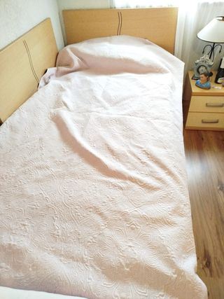 Conjunto de mobiliario para dormitorio. - Dos camas individuales.(90x190) más cabecero . - dos mesilla de noche.(41x41 y39 de alto ) - Un armario con dos puertas y un cajón grande (1.55 de fondo x 1,90 de alto ) hay que grapar el tablón de atrás que se ha soltado de algún lado .
