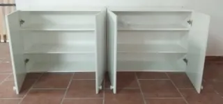 Conjunto de 2 armarios de madera en color blanco, para colgar en la pared Son perfectos para almacenar. Miden 90x3ox70cm cada uno de ellos, - moderno y limpio. - Tiradores redondos. - Base con patas pequeñas.