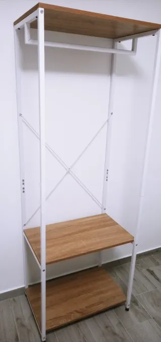 Armario abierto con estructura metálica y baldas de madera. - Diseño moderno y funcional. - Dos baldas amplias para almacenamiento. - Barra para colgar ropa. Lo tengo desmontado listo para poder enviar.