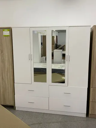 Armario de cuatro puertas con un diseño moderno y funcional. Con espejos y cajones. Muebles nuevos a estrenar. Hacemos portes económicos a tu casa. También podemos montarlos. Te puedes comunicar conmigo (685)89-46*22