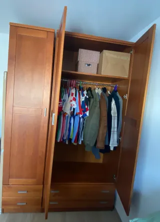 Armario de madera con varios compartimentos y cajones. Tengo dos unidades. - Estante - Dos cajones inferiores de madera. - Colgador para ropa.