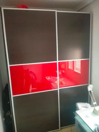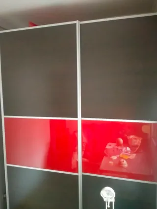 Armario de diseño moderno con puertas correderas. De alto mide mas de dos metros y de ancho unos 150 cm. - Paneles superiores en acabado oscuro. - Paneles inferiores en cristal rojo brillante. - Marco de aluminio plateado. No se desmonta. Lo siento