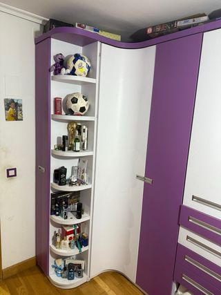 Armario de esquina con un diseño moderno y funcional. - Combinación de colores blanco y morado. - Estructura de madera y plástico. - Incorpora estantes y cajones para almacenamiento.