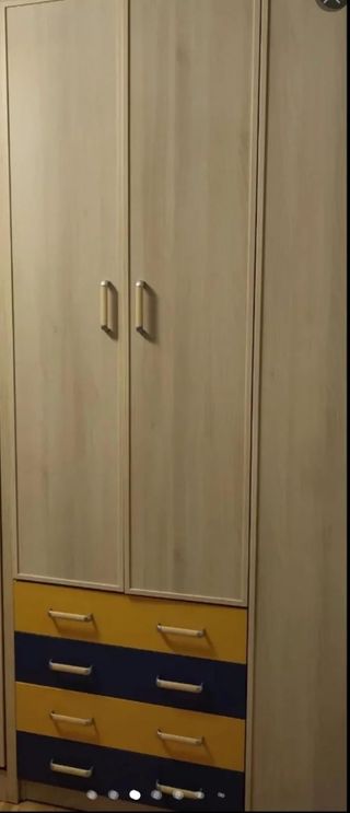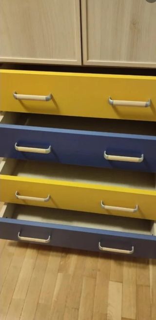 Mueble de almacenamiento para dormitorio infantil, combina puertas de armario y cajones. - Diseño con puertas superiores y cajones inferiores. - 4 Cajones, 2 azules y 2 amarillos. - Tiradores de fácil agarre. Se puede combinar con otro armario que hace juego y que combina cajones de color amarillo y azul, en pack se haría precio especial por los dos, Preguntar precio por privado. Solo venta en persona, Zona A Guarda