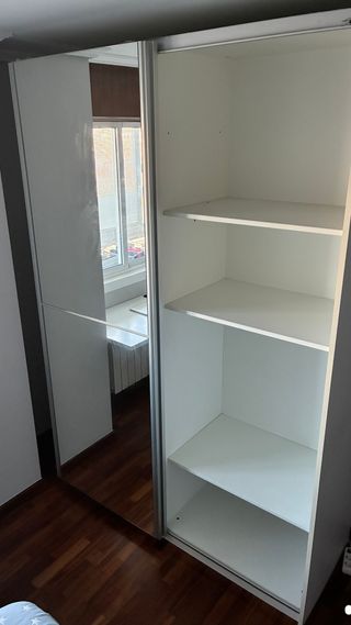 Vendo armario de madera en color blanco, ideal para dormitorio o vestidor: -Medidas: 240 cm (alto) x 160 cm (ancho) x 65 cm (fondo) -Puertas correderas de cristal con acabado en aluminio -Espacioso y moderno, combina con cualquier estilo de decoración -En buen estado, solo algunos signos de uso normales -Con baldas interiores Perfecto para quienes buscan un armario funcional y elegante. ¡Recógelo en Vigo!