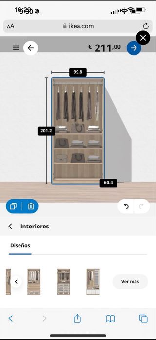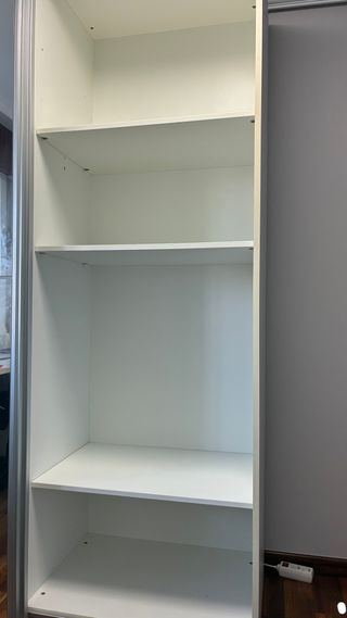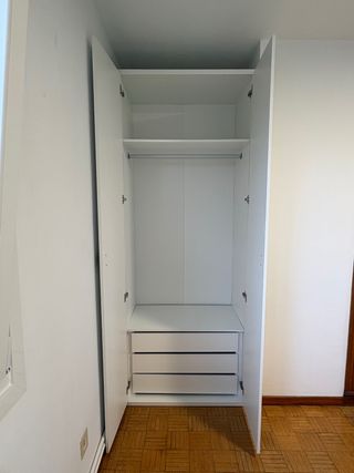Armario de tres puertas de Ikea, modelo PAX. Medidas: -Módulo de 1 puerta: 50x60x236 cm -Módulo de 2 puertas: 100x60x236 cm Completo 150x60x236 cm Interior módulo 1 puerta: - 2 cestos y 6 baldas Interior módulo 2 puertas: - 1 cesto, 2 cajones, 1 colgador y 2 baldas Precio nuevo 517€