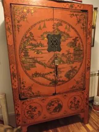 Precioso armario de estilo chino, ideal como objeto de colección y pieza decorativa. - Diseño oriental con detalles dorados. - Elaborado con madera y adornos metálicos. - Color principal rojo.