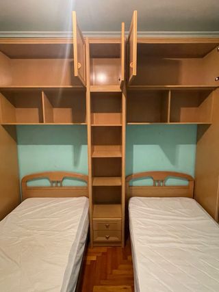 Conjunto de armario modular diseñado para camas individuales. Ideal para optimizar el espacio en habitaciones. - Estructura de madera. - Acabado en tonos beige y marrón. - Múltiples compartimentos y estantes. - Puertas abatibles. El conjunto completo como en la foto de punta punta mide 3,5m de ancho y el alto de los armarios es de 2m