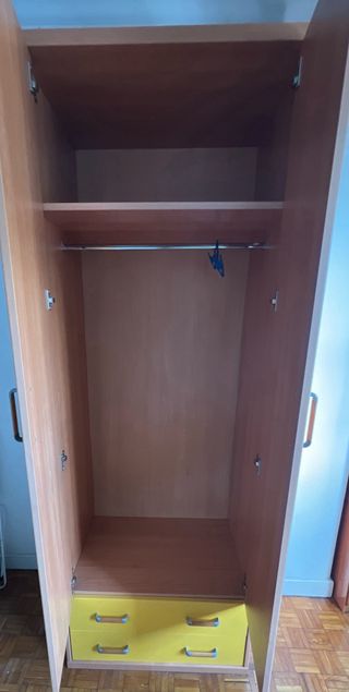 Armario ropero de madera con un diseño clásico y funcional. Cuenta con dos puertas principales y dos cajones en la parte inferior. - Tiradores redondos. - Acabado en tono madera natural. Tiene algún pequeño desperfecto, como se aprecia en las imágenes. En general está decente.