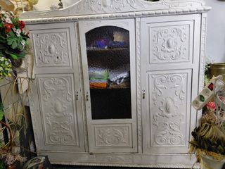Armario de madera con detalles tallados y puerta central de cristal. - Diseño clásico y elegante. - Puertas con tiradores metálicos. - Estructura robusta.