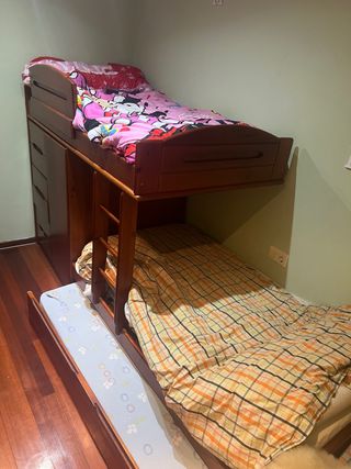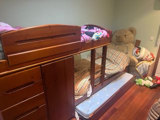 Conjunto de camas nido de madera natural, ideal para habitaciones infantiles o juveniles. Incluye un práctico armario y cajones para almacenamiento. - Estructura de madera maciza. - Armario integrado. - Cajones adicionales. 3 colchones