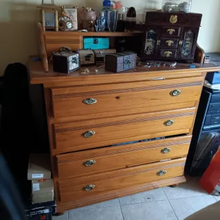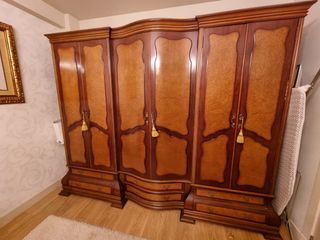 Dormitorio de madera con un diseño clásico y elegante. Sus puertas talladas y tiradores le dan un toque distinguido. - Amplio espacio de almacenamiento. - Acabado en madera de cerezo. - Muebles de gran calidad. - Armario de 3 puertas dobles y 3 cajones - Cómoda de 6 cajones - Cama de 135 - 2 mesillas de 3 cajones Precio negociable