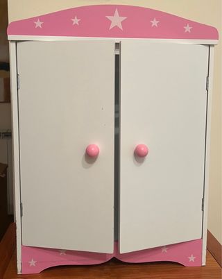 Armario para ropa de muñecas con un diseño encantador. - Decorado con estrellas en la parte superior e inferior. - Puertas con pomos redondos. - Acabado en blanco con detalles en rosa.