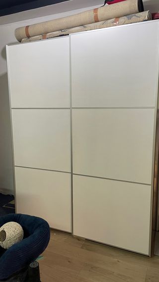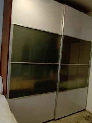 Armario de tres módulos de Ikea en color blanco. Cuenta con puertas de cristal. Módulo de la izquierda y derecha 90x214 cm. Módulo centras 84x214 cm. También Se venden módulos solos. Desmontaje y portes por parte del comprador.