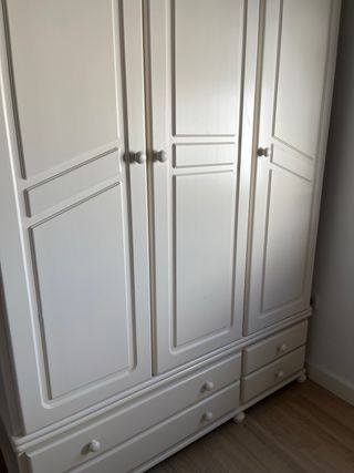 Precioso armario de madera de pino, acabado en blanco. Ideal para dormitorio o habitación. - Tres puertas con detalles decorativos. - Cuatro cajones en la parte inferior. - Diseño clásico y elegante. - Se encuentra en buen estado.