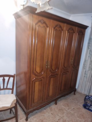 Dormitorio compuesto por armario de 4 puertas, cama de 1'35, alto cabecero 136, ancho 145, fondo 220 cómoda alto 172, ancho 105 , fondo 220 con espejo, dos mesitas de alto 72, ancho 60, fondo 39 y una silla. Tiene unos 70 años y está hecho a mano y está como nuevo , color caoba.