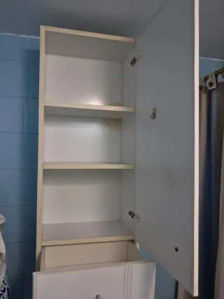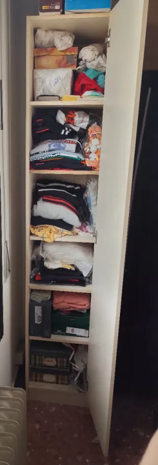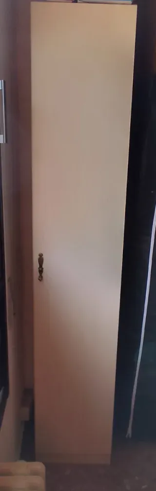 Armario de baldas de madera color beige con tirador dorado. Con mucha capacidad, a juego con un armario ropero que tengo anunciado también. Medidas exteriores: 36cms ancho 1'95mts alto 40cms fondo 5 baldas con distancia entre ellas de entre 28,5cms y 31,4cms. Cabe montado en el ascensor. Se recoge en La Paz.