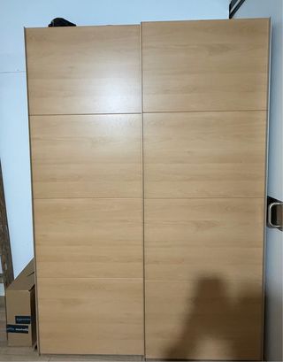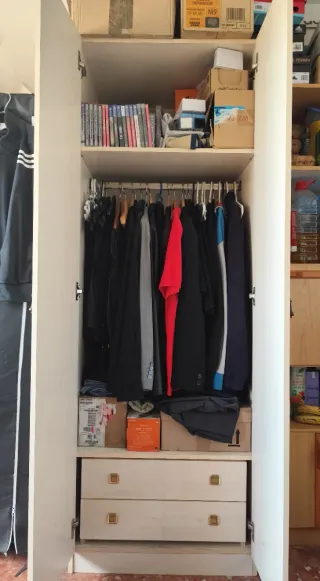 Armario ropero de madera en color beige con tiradores dorados de dos puertas con mucha capacidad. Consta de balda superior, espacio para colgar cazadoras, pantalones, etc y dos cajones inferiores. Medidas: 68'2cms ancho 1'95mts alto 56cms fondo Medidas exteriores. No cabe en el ascensor, tendrás que desmontarlo y bajarlo por piezas. Es un tercer piso pero desmontado sí que entra en el ascensor. Puedo adjuntar un armario con baldas a juego, una extensión, por 15€ más, que tengo en otro anuncio. Se recoge en La Paz.