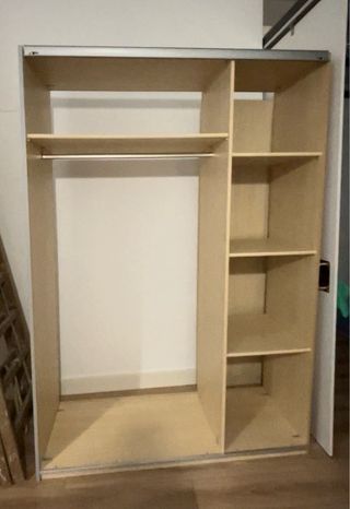 Armario de madera con un diseño sencillo y funcional. - Dos estantes superiores. - Espacio amplio para colgar ropa. - Base inferior para almacenamiento adicional. Y dos armarios uno de ellos con cuatro baldas y otro con siete baldas