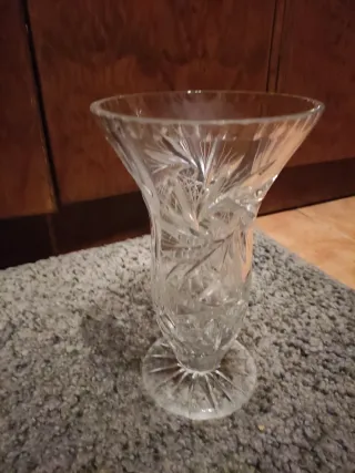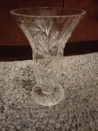 Elegante jarrón de cristal tallado con un diseño intrincado. - Estilo Bohemia. - Base ancha y pie decorado. - Diseño floral y geométrico.