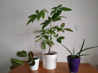 NO MAREANTES. PRECIO NO NEGOCIABLE Conjunto de tres plantas naturales. - Planta de interior maranta con hojas verdes y rojizas. - Planta alta pachira acuática con tronco y hojas verdes. - Planta sansiviera cilindrica con hojas alargadas y verdes. - maceta de cerámica blanca - maceta de cristal violeta - todo el lote 23€ - lo tengo en arrecife