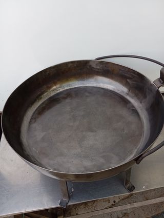 Preciosa plancha para fuego, útil para asados de carnes, hacer paellas o cualquier tipo de guisos al aire libre. Es de metal, con un diseño muy resistente y duradero, el rabo es plegable para mejorar el transporte, hecha de forma totalmente artesanal. - Perfecta para usar en cualquier tipo de fuego. - Tiene patas para una estabilidad óptima. - Incluye un asa para facilitar su manejo. Medidas: Largo con rabo extendido: 123cm Largo con rabo plegado: 94cm Diámetro: 58cm Altura: 31cm