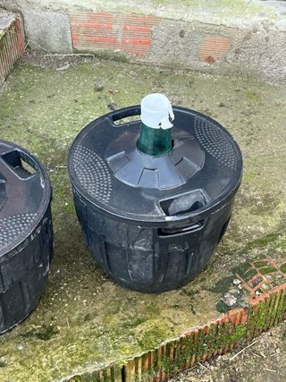 Conjunto de garrafas para vino, con detalles en verde y negro. - Materiales combinados de plástico y vidrio. - Diseño robusto y funcional.