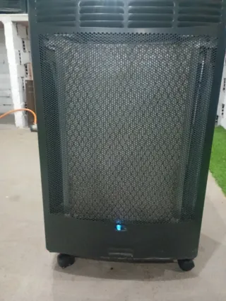 Estufa de gas portátil, ideal para calentar espacios. - Diseño moderno en color negro. - Incorpora ruedas para facilitar su movilidad. - Fabricada con materiales resistentes.