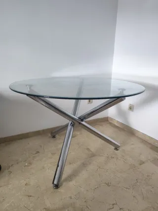 Elegante mesa de salón con sobre de cristal y base de aluminio. - Diseño moderno y minimalista. - Patas cruzadas de aluminio pulido. - Sobre circular de cristal templado. El aluminio hay partes que habría que limpiarlo ya que hace tiempo que no se usa. Cristal perfecto estado La mesa necesita al menos dos personas para transportarla ,pesa. Recogida montada a poder ser