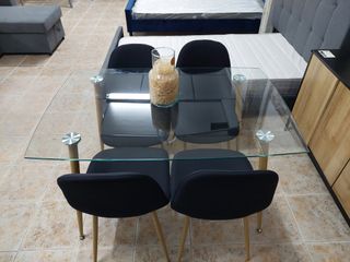 Mesa cristal 120cm + 4 sillas tela negras