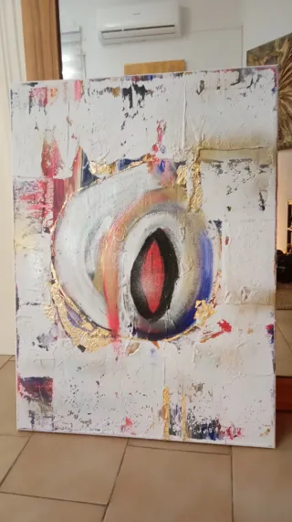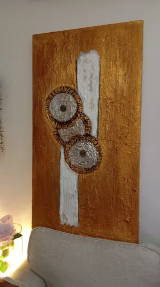 Cuadro abstracto pintado a mano sobre lienzo. Presenta un diseño texturizado con detalles en dorado y blanco. - Acabado brillante. - Elementos decorativos circulares. - Técnica mixta.
