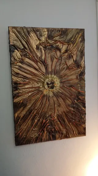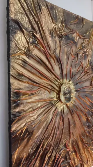 Cuadro abstracto pintado a mano sobre lienzo. Presenta un diseño texturizado con un centro de cristal. - Acabado metálico con tonos dorados y marrones. - Textura tridimensional. - Marco negro.
