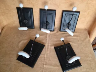 Cinco percheros individuales, con base de madera, percha de metal y cerámica. Medidas: - Base: 15 x 20 cms - Percha: 22 cms