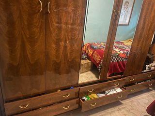 Armario de madera con un diseño clásico y elegante. Sus puertas con espejo aportan amplitud y luminosidad a la estancia. - Tres puertas. - Acabado en madera veteada. - Tiradores dorados. - Tiene seis cajones grandes. - Gran capacidad de almacenamiento.