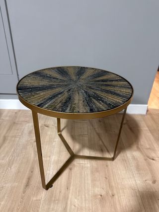 Elegante mesa auxiliar con un diseño moderno y llamativo. Su sobre redondo presenta un patrón radial en tonos negros y dorados, aportando un toque de sofisticación a cualquier espacio. La base metálica le confiere estabilidad y un acabado contemporáneo. - Sobre con diseño radial. - Base metálica dorada.