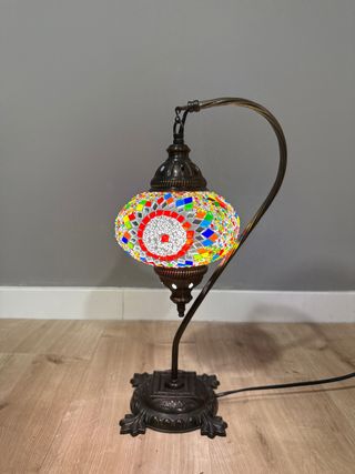 Elegante lámpara de mesa con un diseño de mosaico vibrante. Su base y brazo curvo le dan un toque distintivo. - Pantalla de cristal con incrustaciones de mosaico. - Base y estructura de metal con acabado dorado.