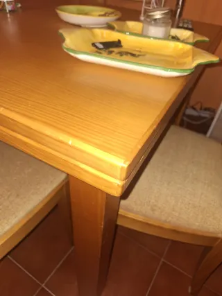 Conjunto de mesa de comedor de madera de pino y seis sillas a juego. - Mesa de comedor de madera de pino. Como nueva. Es extensible. Nunca se ha abierto. Está muy bien cuidada. - Incluye seis sillas a juego tapizadas.
