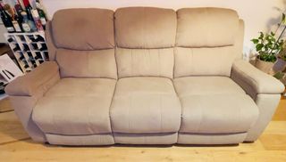 Cómodo sofá de tres plazas con sistema relax eléctrico y prácticos posavasos integrados. Tela lavable. Se puede dividir en tres módulos para su transporte. El precio es con el envío incluido. Si se recoge en el domicilio se descontará un 10% del mismo. - Tapicería de tela lavable. - Color beige. - Posavasos. - Control eléctrico de reclinaje en los asientos de los extremos. - Asiento central fijo.