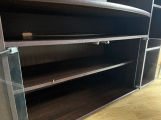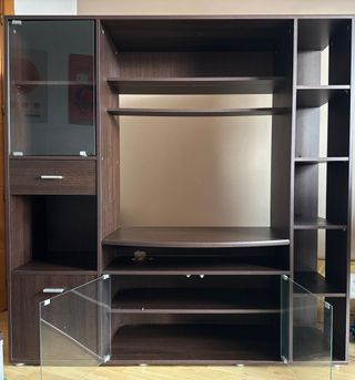 Mueble de salón Conforama con un diseño moderno y funcional. - Combinación de madera oscura y cristal. - Incluye vitrinas para exposición. - Amplio espacio de almacenamiento. Buen estado general para su antigüedad (12–15 años). Presenta signos normales de uso. Uno de los estantes inferiores tiene un pequeño agujero trasero hecho en su día para el paso de cables (DVD), no visible una vez montado y funcional si se usan dispositivos electrónicos (ver foto). Recogida en Puente de Vallecas (Madrid). Se ayudará al comprador en el desmontaje el día de la recogida.