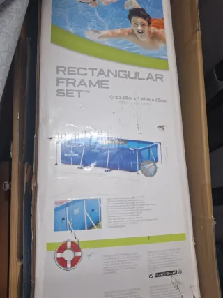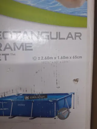 Piscina familiar Intex con estructura metálica. - Medidas: 2.60m x 1.60m x 65cm. - Capacidad: 2282L. - Fácil montaje Incluye suelo y depuradora y un filtro y productos para 1 mes de uso.