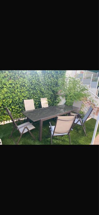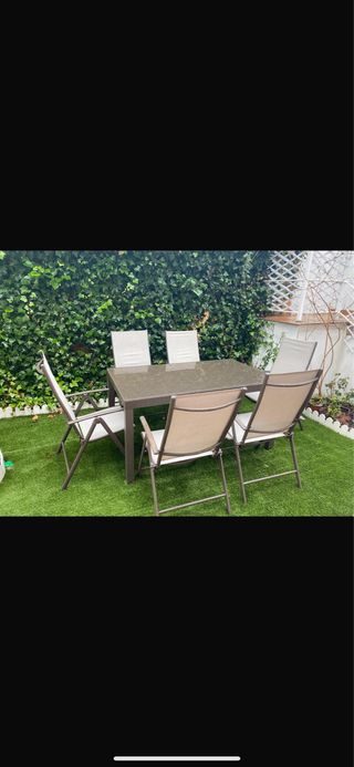 Conjunto de mesa y seis sillas para exterior. Ideal para disfrutar del buen tiempo en tu terraza o jardín. - Mesa con sobre de cristal. - Estructura metálica. - Sillas con asiento y respaldo de tela. Mesa extensible a 2,20,230 , si No tienes como llevartelo te lo acerco en un radio de 20 km