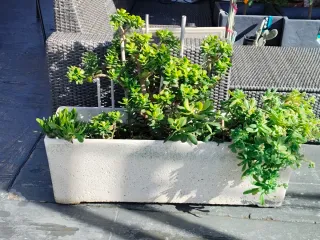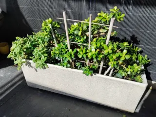 Jardinera de piedra con un exuberante árbol de Jade. - Planta de exterior pero hay que protegerla de las heladas - Tiene varios árboles de Jade y dos plantas de la familia de las suculentas. - La tierra es de buena calidad