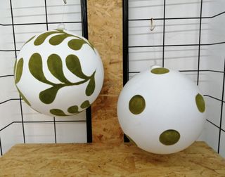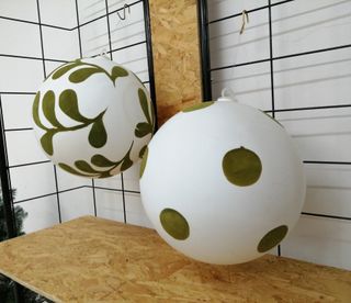 Set de dos bolas de Navidad de gran tamaño, cada una de 30 cm de diámetro. Presentan un diseño llamativo con motivos decorativos en color verde oliva sobre fondo blanco. - Diseño de hojas verdes en una bola. - Diseño de puntos verdes en la otra bola.
