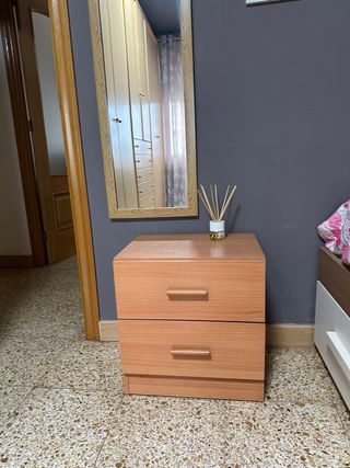 Mesita de noche con dos cajones, ideal para complementar tu dormitorio. Su diseño sencillo y funcional se adapta a cualquier estilo. - Acabado en madera clara. - Dos cajones con tiradores integrados.