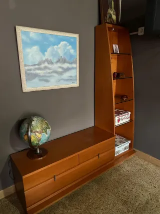 Elegante conjunto de muebles para el comedor, combinando la calidez de la madera con la transparencia del cristal. - Vitrina con puertas de cristal. - Mueble bajo con cajones y compartimentos. - Estante superior. -Mueble tv A recoger en Manresa.