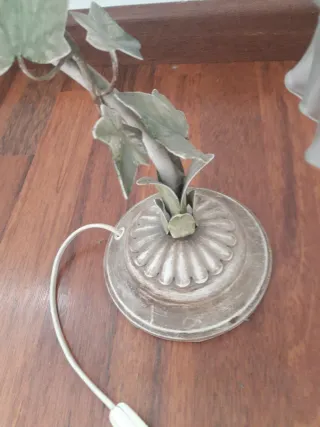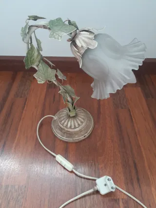Elegante lámpara de forja con un diseño floral . - Base decorativa con relieve. - Tallo curvo adornado con hojas. - Pantalla de cristal con forma de flor.