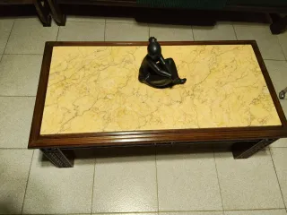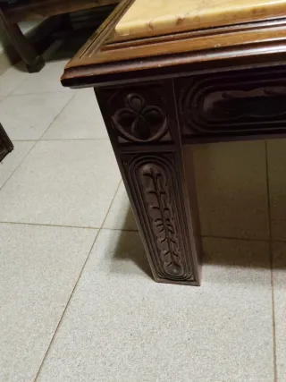Elegante mesa baja con superficie de mármol y estructura de madera tallada. - Diseño clásico y sofisticado. - Detalles de talla artesanal en la madera.