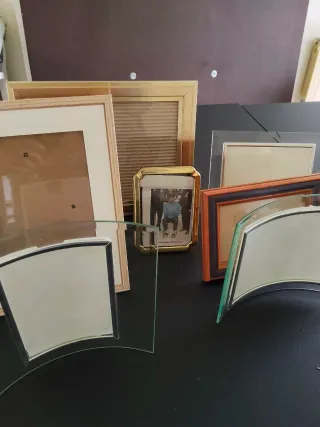 Conjunto de marcos de fotos de diferentes tamaños y estilos. 23x29. Madera 26.5x21.5. Madera 18,5x20,5 Vidrio Curvado 20x17 Vidrio Curvado 20x15 Vidrio Plano 10x14 Dorado 19x13. Madera - Marcos con acabados dorados de madera y vidrio - Marcos de cristal doblado - Diseños variados para distintas ocasiones.