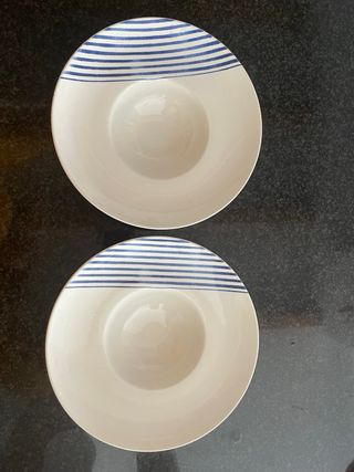 Conjunto de platos blancos de porcelana con un elegante diseño de líneas finas. - Diámetro aproximado de 24 cm. - Apto para lavavajillas. - Apto para microondas. -mar a arcopal extraresistente Vajilla compuesta por 17 piezas blancas con fina línea en gris y rojizo, consta de: 8 platos llanos grandes de 24 cm diámetro 7 platos hondos de 23 cm de diámetro Y 2 platos llanos pequeños de 19 cm de diámetro. Tienen uso pero están en buen estado. Se hacen packs y envios por wallapop o entrega en mano en Artés