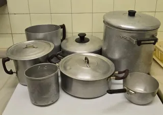 Conjunto de ollas de aluminio de estilo antiguo. Son piezas clásicas para la cocina. - Material: Aluminio. - Diseño vintage.
